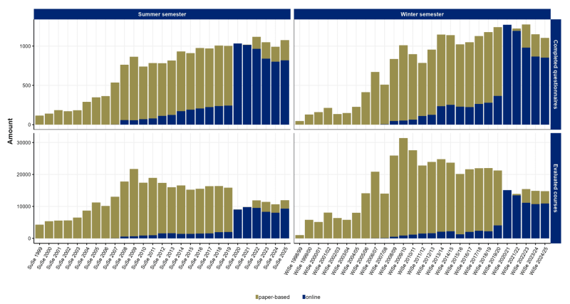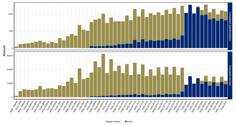 Since the beginning of the systematic evaluation of teaching by the "Central Office for Teaching Evaluation" there has been an increase in the use of our offer. With meanwhile more than 900 courses evaluated per semester, our evaluation service is used most frequently throughout the university. In this way, an average of around 12,000 course evaluations from the students' point of view are recorded and evaluated each semester.